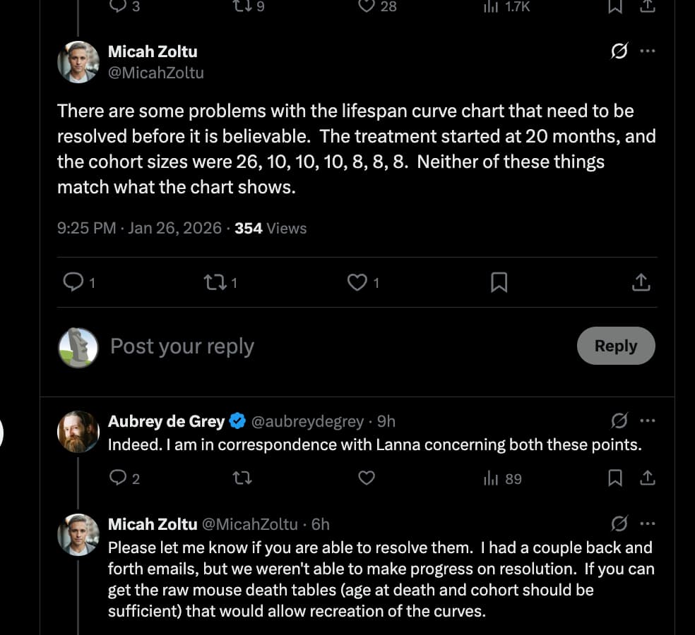 - The Anomaly: However, the magnitude of the effect in the treatment group renders the “weak control” argument moot. The treated mice did not just recover to the 900-day baseline; they shattered it, living to ~1,400–1,800 days. While short-lived controls typically inflate relative (%) gains, they cannot explain the absolute survival duration observed here, which exceeds the species’ known biological ceiling.