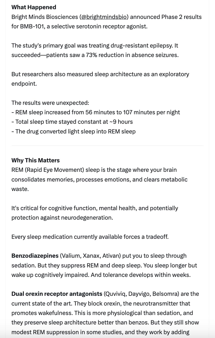 If a drug reliably drives REM to 40%, the more relevant questions are sleep continuity, next-day function, and whether other stages (especially deep NREM/SWS) are being displaced, plus side effects.