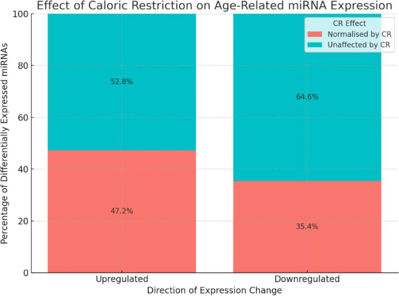 Impact of CR on miRNA expression. A bar chart showing the number of genes upregulated and downregulated in the muscle of aged rats fed ad libitum (AL), when compared to the muscle of old rats fed AL, and what percentage of these are normalised by caloric restriction (CR). Upregulated miRNAs: 17 (47.2%) were normalised by CR, 19 (52.8%) were unaffected by CR; Downregulated miRNAs: 17 (35.4%) were normalised by CR, 31 (64.6%) were unaffected by CR