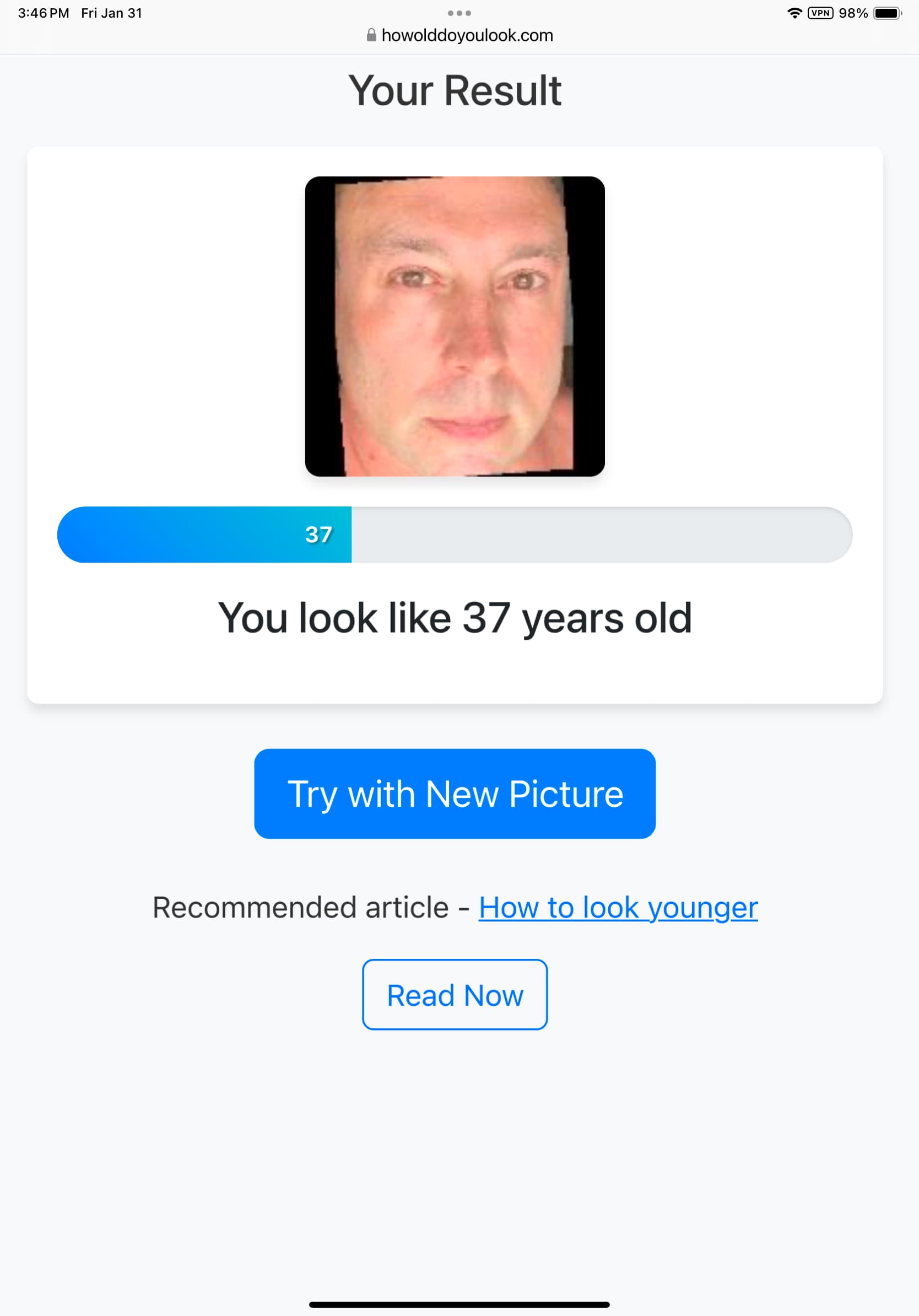 Here is a facial age pic taken in the morning with good sunlight and submitted to one of those “AI- How old am I” sites.