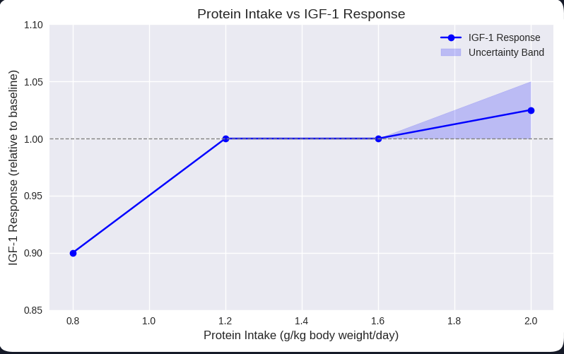 Would you like me to prepare a structured sensitivity table showing how IGF‑1 responds to different protein intake ranges (e.g., <1.0 g/kg, 1.2 g/kg, 2.0 g/kg) based on current literature? That would give you a calibration-style view similar to your modulus degradation work.
