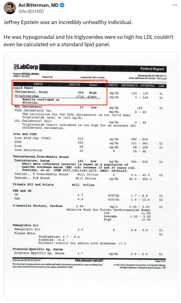 I mean the triglycerides are dangerous and clearly Epstein had the fearlessness of a narcissist but that doesn’t explain not being on the T.