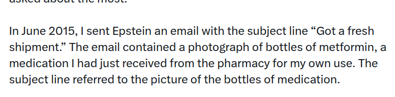 On his latest twitterX post Attia describes the “fresh shipment” as metformin. I find it odd phrasing. Metformin is as common as table salt, cheap, super easy to obtain. Suppose it was a purchase of aspirin or rosuvastatin? Would anyone say “I got a fresh shipment of aspirin” or “I got a fresh shipment of my statins?” Using the term fresh shipment for common non-perishable items is odd and I can’t see myself using such phrasing, ever, it would be a type of “mis-communication” I might use it for an elite olive oil, or blueberries, or a refrigerated medicine (glp1?) but I’d never describe metformin in such “elite” terms. So I am not convinced by his explanation. Why would you bother telling a man you adored and wanted to impress that you got some metformin, who cares, not impressive, plebeian, low class, not impressive or even interesting. I searched but could not find the initial email with the picture of metformin, if it exists on the FBI site, I stand corrected.