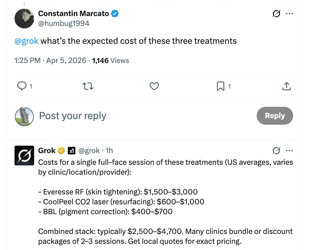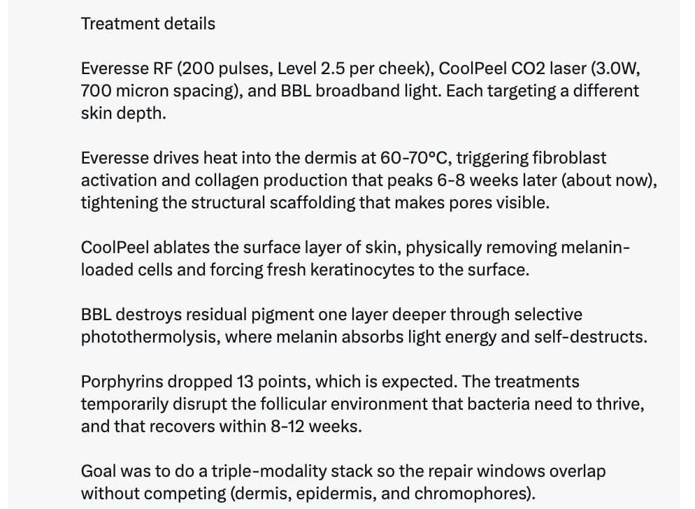 1550-nm laser (1x every 6 months, can do more or less depending on your status and goals) - penetrates deeper into the mid-dermis, where it creates controlled microthermal injury that stimulates fibroblasts to produce new collagen and elastin, leading to improvements in skin firmness, wrinkles, acne scars, and overall structural integrity.