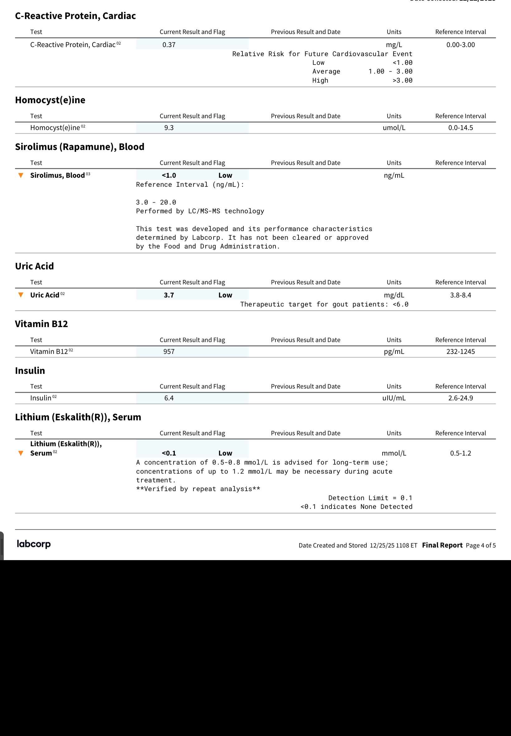 I got some blood tests from LabCorp just before my ACDF surgery, to make sure my sirolimus levels were zero. While at it I also took the opportunity to get some other tests, including ApoB, which I didn’t get back in October at UCLA. So, this is while on 4mg pitavastatin, bempedoic acid 180mg + ezetimibe 10mg. However, at the point of the test I was no longer taking empagliflozin, telmisartan or rapamycin (in preparation for the surgery).