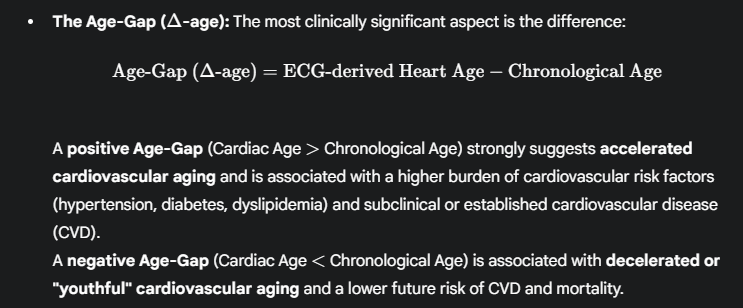 The fundamental idea behind Cardiac Age is that the electrical patterns recorded by an ECG reflect not only acute cardiac issues but also subtle, cumulative age-related structural and electrophysiological changes in the heart (e.g., increased cardiac fibrosis, changes in conduction velocity, or mild hypertrophy) that are difficult to discern with conventional visual ECG analysis.