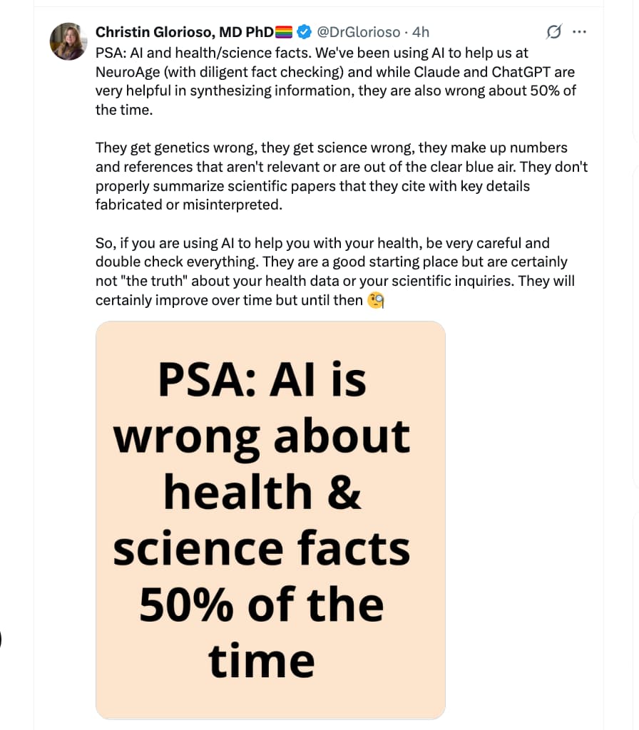 In general, I’ve found it best to ask the same health questions among multiple LLMs (Gemini/Grok/ChatGPT/ClauseSonnet). I think that’s especially true now, as ChatGPT has been regressing recently by almost every metric.