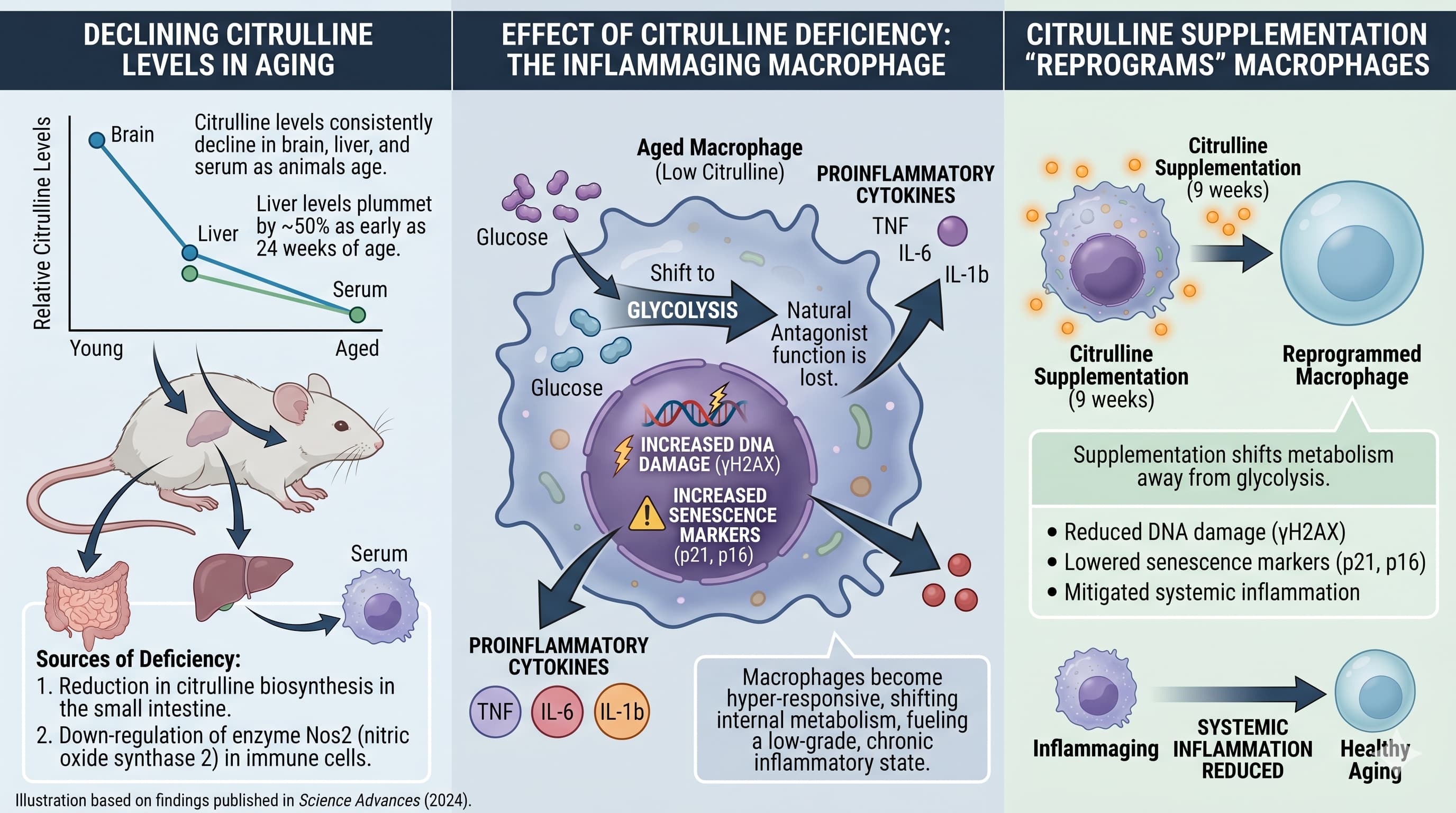 The biological consequences of this shortage are significant. The study found that citrulline acts as a natural antagonist to inflammation. When citrulline levels are low, macrophages become hyper-responsive, shifting their internal metabolism toward glycolysis —a process that fuels the secretion of proinflammatory cytokines like TNF , IL-6 , and IL-1b. Crucially, the researchers demonstrated that supplementing aged mice with citrulline for nine weeks effectively “reprogrammed” these macrophages. This intervention reduced markers of DNA damage (yH2AX ), lowered the expression of senescence markers (p21 , p16 ), and mitigated systemic inflammation.
