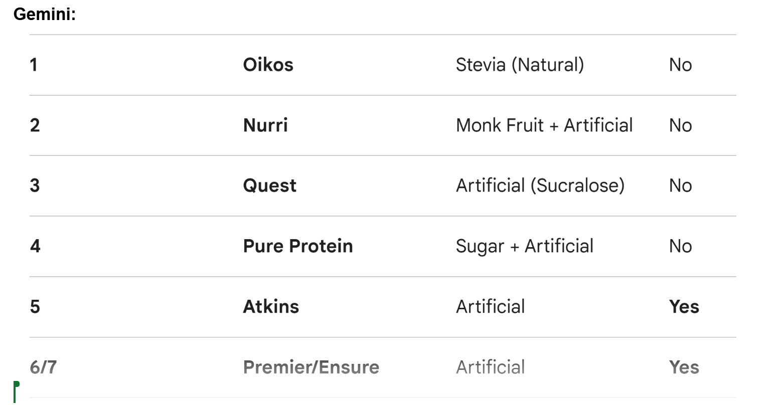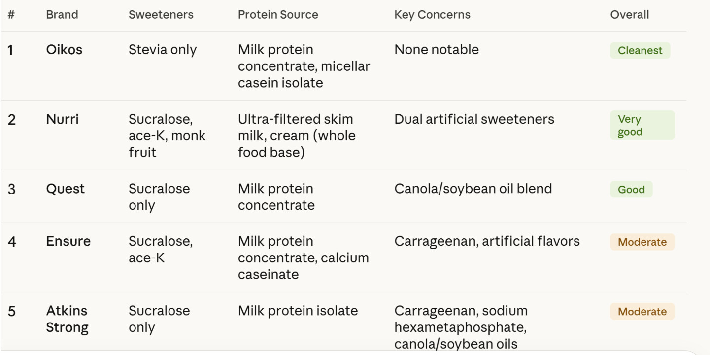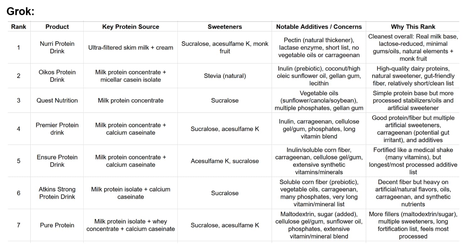 Though protein drinks usually describe themselves as milkshakes, that is a stretch IMO. I like the Nurri because it is about the same consistency as chocolate milk and has clean ingredients compared to most of the protein drinks. I asked three different AIs to rank some of the more common protein drinks. I prefer the taste of Nurri to Oikos.