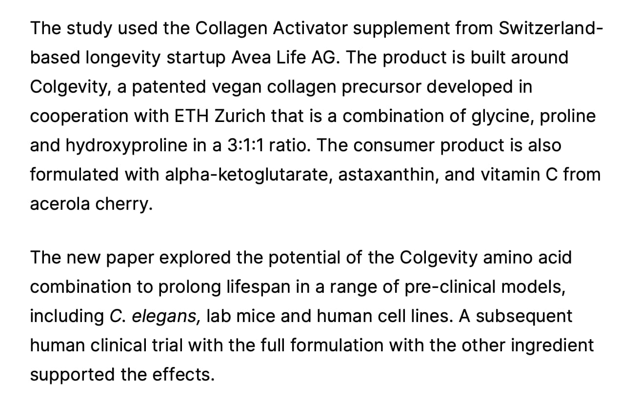 - In C. elegans, the 3:1:1 glycine:proline:hydroxyproline (Gly:Pro:Hyp) mix extended mean lifespan by **6–27%**across five independent trials, outperforming bulk collagen extract. Worms retained collagen-reporter expression and better “healthspan” (swimming/thrashing) late in life.