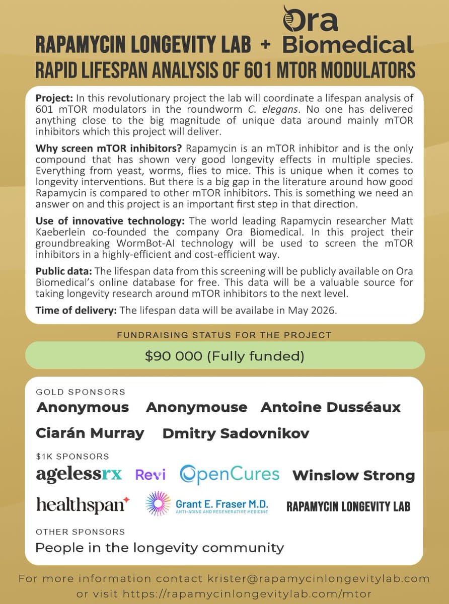 "We have officially reached our funding goal for the largest-ever lifespan analysis of 601 mTOR modulators! This project is driven by Rapamycin Longevity Lab (@omipalRLL) in partnership with
