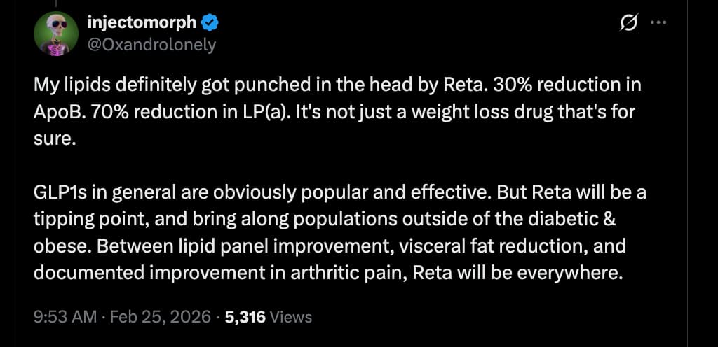 Reta has had zero effect on my Lp(a), even at 6mg/week. I notice that the poster on X is posting on a forum (Oxandrolonely?). Oxandrolone is an anabolic steroid that does decrease Lp(a), so my guess is there’s a confounding variable involved here.