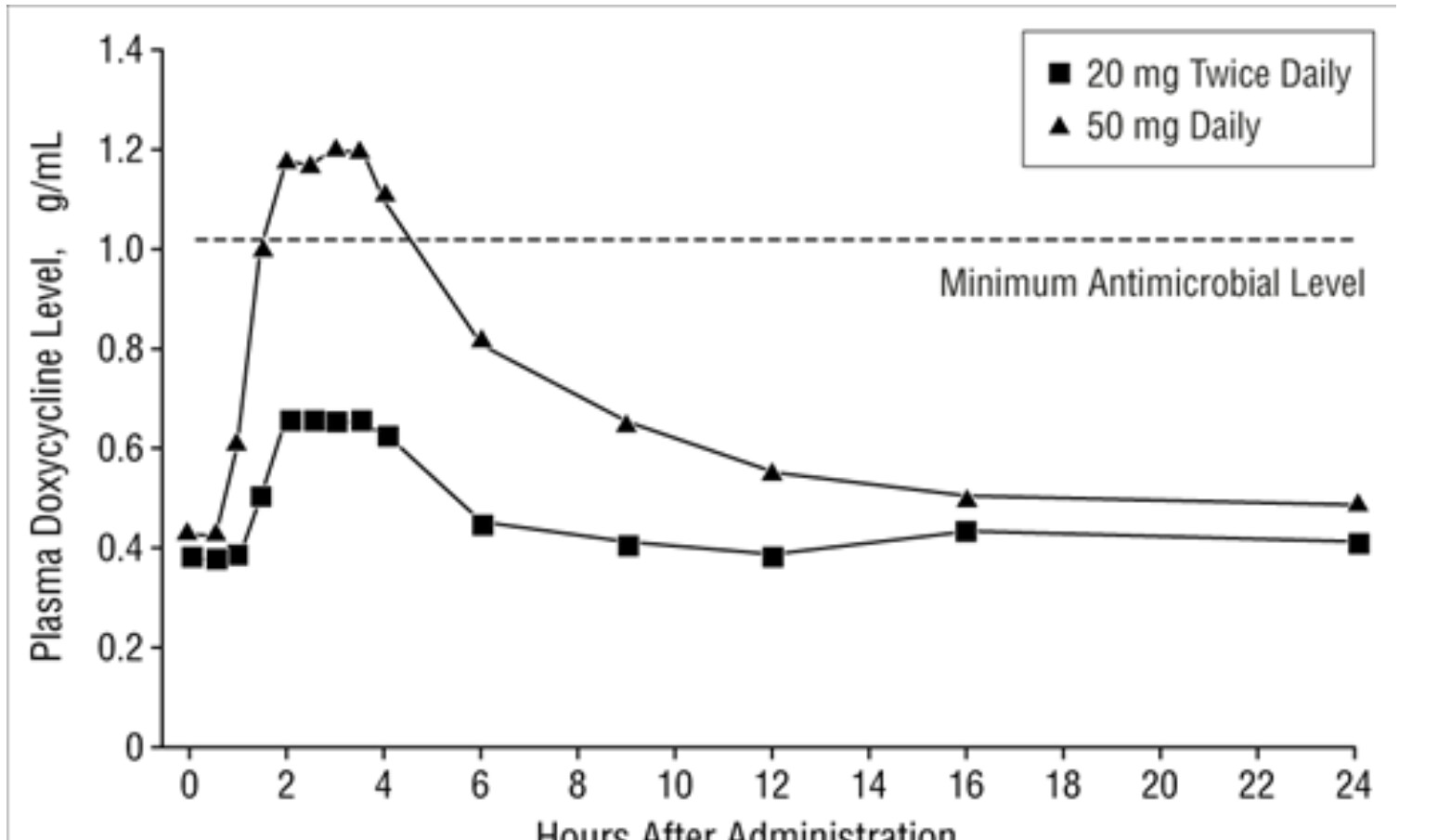 This mechanism led to the development of sub-antimicrobial dose doxycycline (SDD), formulated as 20 mg (Periostat) and later 40 mg controlled-release (Oracea). These formulations maintain serum levels (0.3–0.8 µg/mL) that are potent against MMPs but fall below the minimum inhibitory concentration (MIC) for common pathogens, thereby avoiding the selection of resistant bacterial strains—a crucial safety feature for any proposed “anti-aging” maintenance therapy.