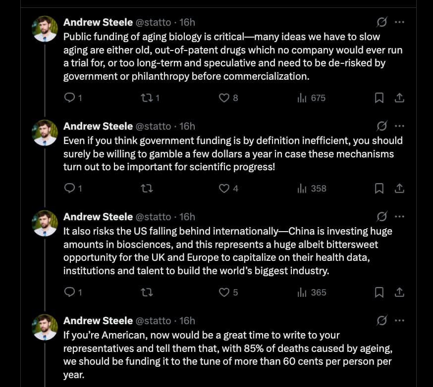 In a fresh series of posts on X, Longevity Science advocate Andrew Steele highlights a dramatic and unprecedented reduction in the proposed budget for the U.S. National Institute on Aging (NIA) for fiscal year 2026: slashing $1.8 Billion from the budget, a cut of over 40% compared to the 2025 enacted level.
