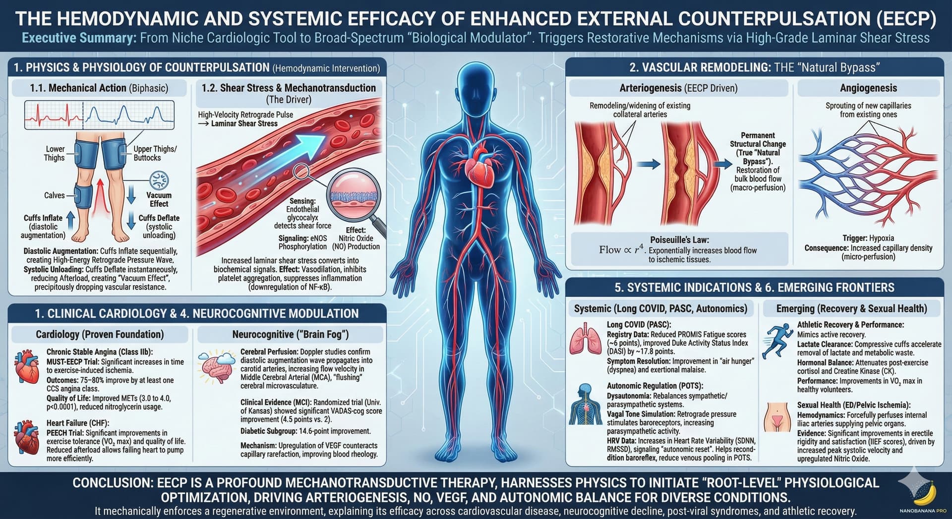 Enhanced External Counterpulsation (EECP) is evolving from a niche cardiological tool into a broad-spectrum physiological intervention. While historically FDA-cleared for refractory angina and heart failure, the aggregated literature suggests that EECP functions as a systemic “biological modulator.” By manipulating hemodynamics to generate high-grade laminar shear stress, the therapy triggers a cascade of restorative mechanisms—ranging from arteriogenesis and endothelial repair to autonomic balancing.
