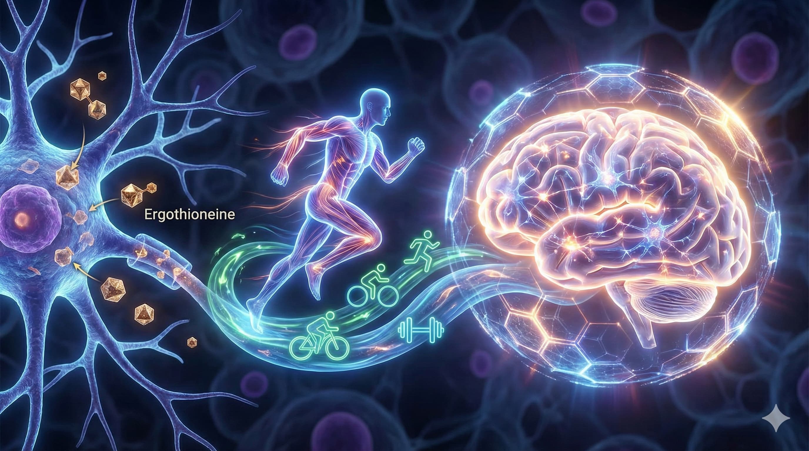 The “Big Idea” centers on biological complementarity. Ergothioneine is a unique sulfur-containing compound that humans cannot synthesize but must acquire from specific foods like mushrooms. It utilizes a dedicated transporter, OCTN1, to cross the blood-brain barrier and accumulate in high-stress tissues, where it acts as a “thione-based” antioxidant resistant to auto-oxidation. While exercise drives neurogenesis and improves cerebral blood flow, ET provides the cytoprotective “shield” required to protect those new neurons from oxidative stress. Critically, preliminary animal data suggests ET may even enhance exercise performance—extending time to exhaustion by 40%—without blunting the beneficial adaptive signaling (mitohormesis) that typically plagues traditional antioxidants like Vitamins C and E.