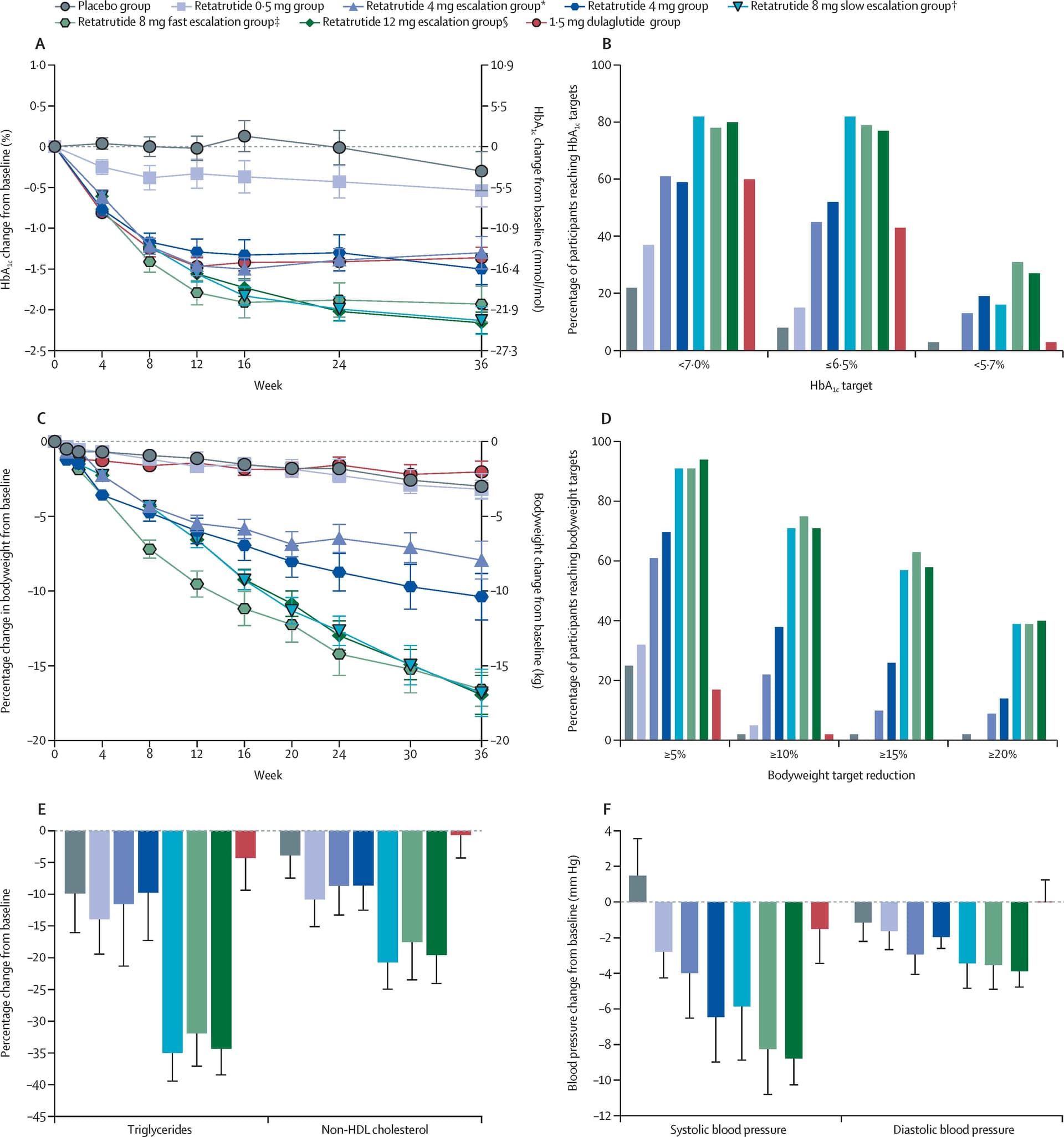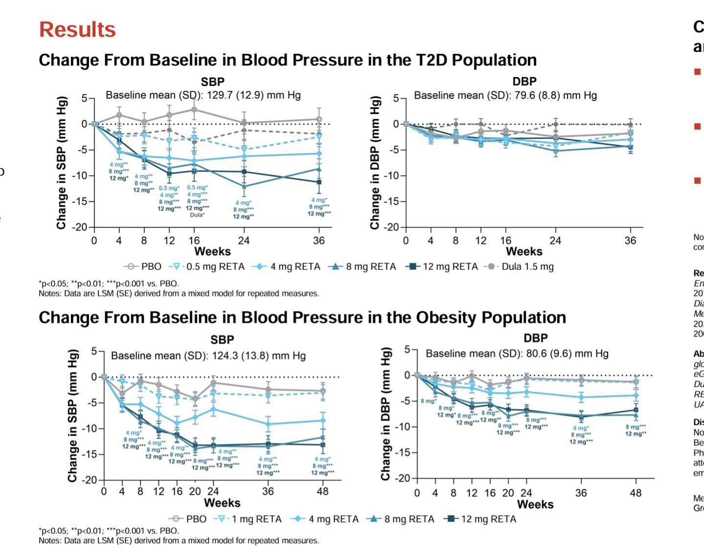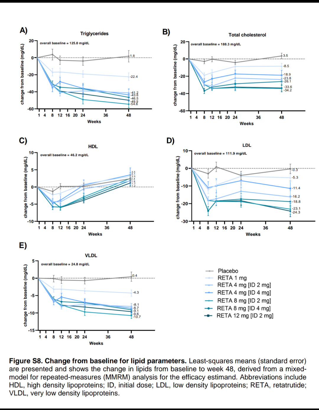 With retatrutide, the more interesting question is whether metabolic benefits are maintained if your weekly dose is less than 4mg. That’s because when looking the various improvements in metabolic markers, the minimum dose where these improvements happened was in the 4mg arm.