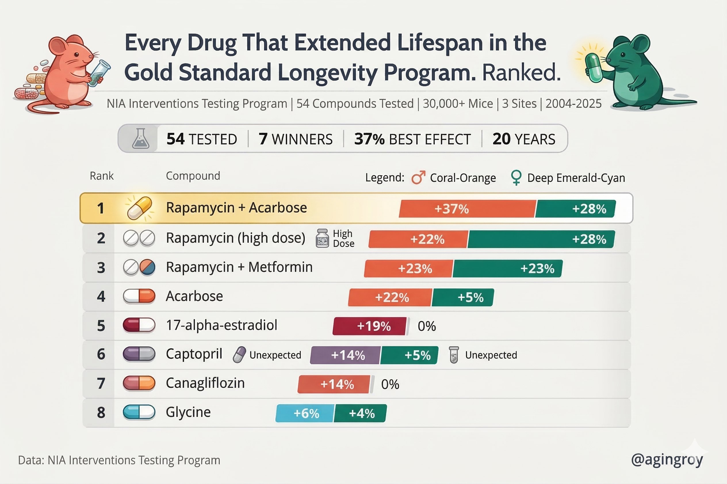 NIA 's Interventions Testing Program (ITP) published its most important finding. It’s not about which drug won. It’s about who it works for. Rapamycin + acarbose: 34% median lifespan increase in males. 28% in females. The largest effect the program has ever recorded. Better than either drug alone. But here’s the pattern nobody’s discussing: 12 of 13 life-extending compounds in the ITP worked primarily in males. Rapamycin is the single exception. The only longevity compound that works better in females. We’ve spent two decades testing longevity drugs in both sexes. The answer was staring back the whole time: longevity pharmacology has a sex problem.
