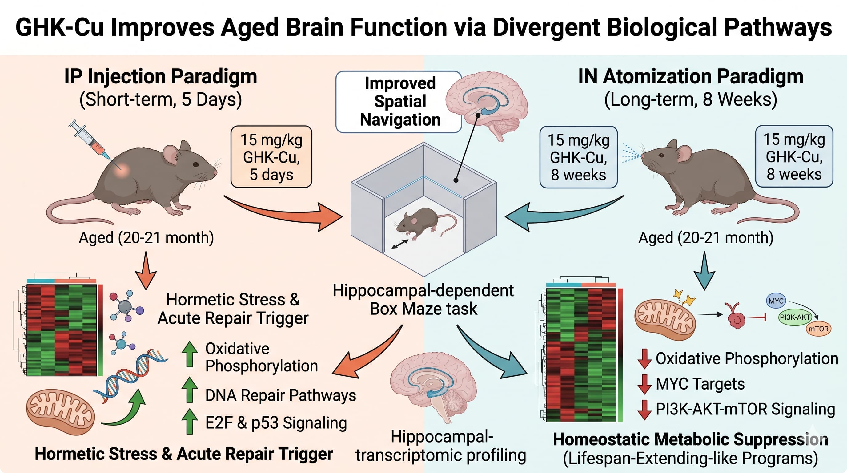 4. How do you rule out that the IP “repair” signature isn’t just a toxic stress response to copper spiking? The study cannot rule this out. The short-term IP dosing triggered DNA repair and inflammatory TNF-alpha/NF-kB pathways in females, which are canonical responses to metabolic stress or tissue injury. It is plausible the IP method induced a mild, transient toxicity that improved maze times through acute stress-arousal rather than genuine neural rejuvenation.