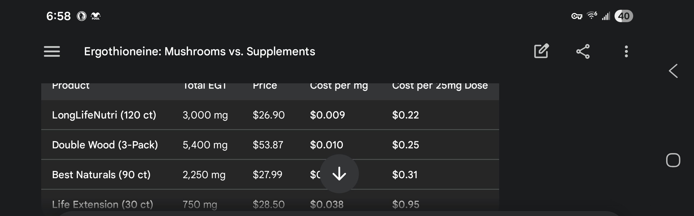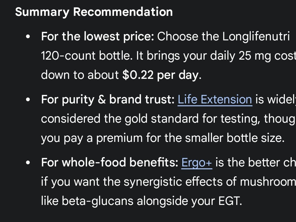 Real Mushrooms brand is what I ordered (10mg EGT per capsule, will take 2 caps/day), but I’ll probably switch to the Life Extension brand when I’m done with this bottle since it’s 25mg per 1 capsule and less expensive for the month’s supply, just doesn’t have the beta-glucan that’s in the Real Mushroom brand.
