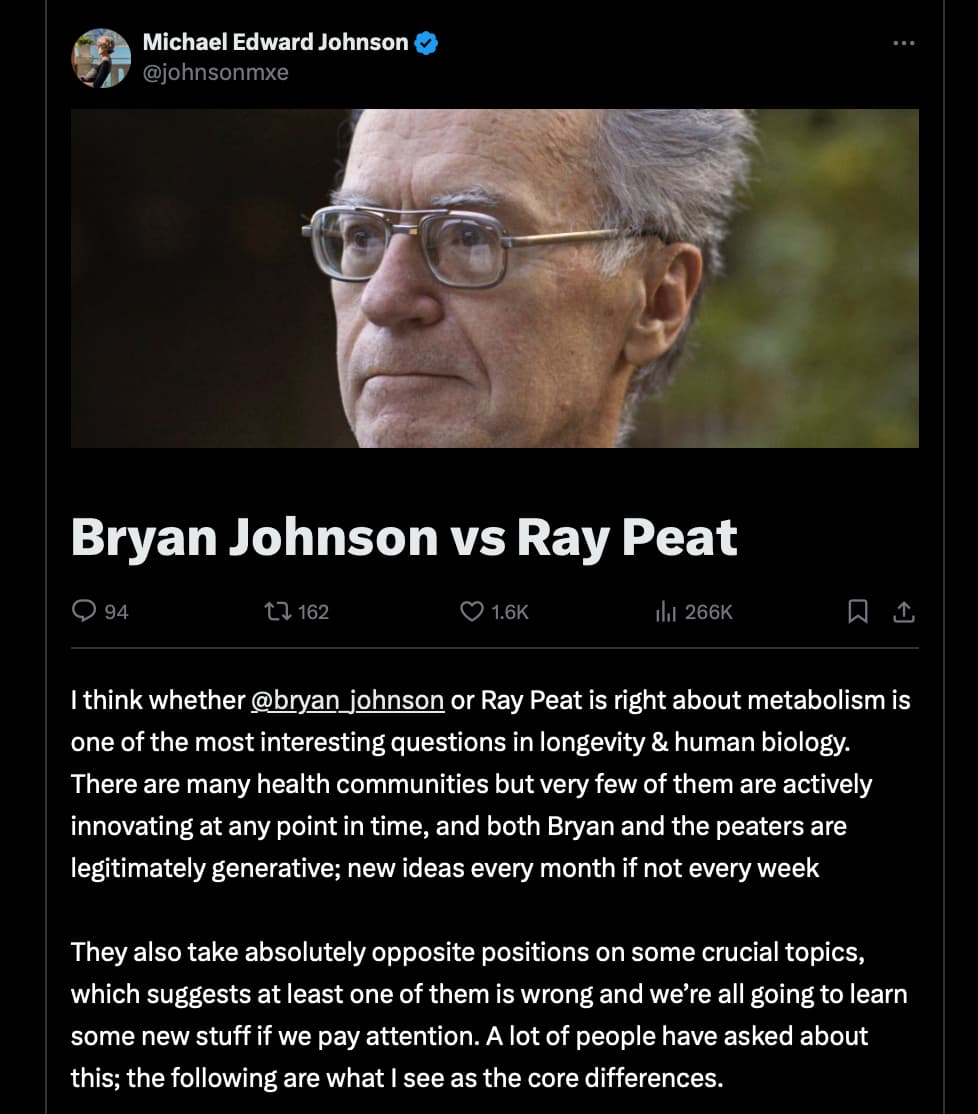 Using the best scientific and clinical research, Critique the two different approaches, beliefs and statements by Bryan Johnson and Ray Peat as outlined in the following text: (your X link)