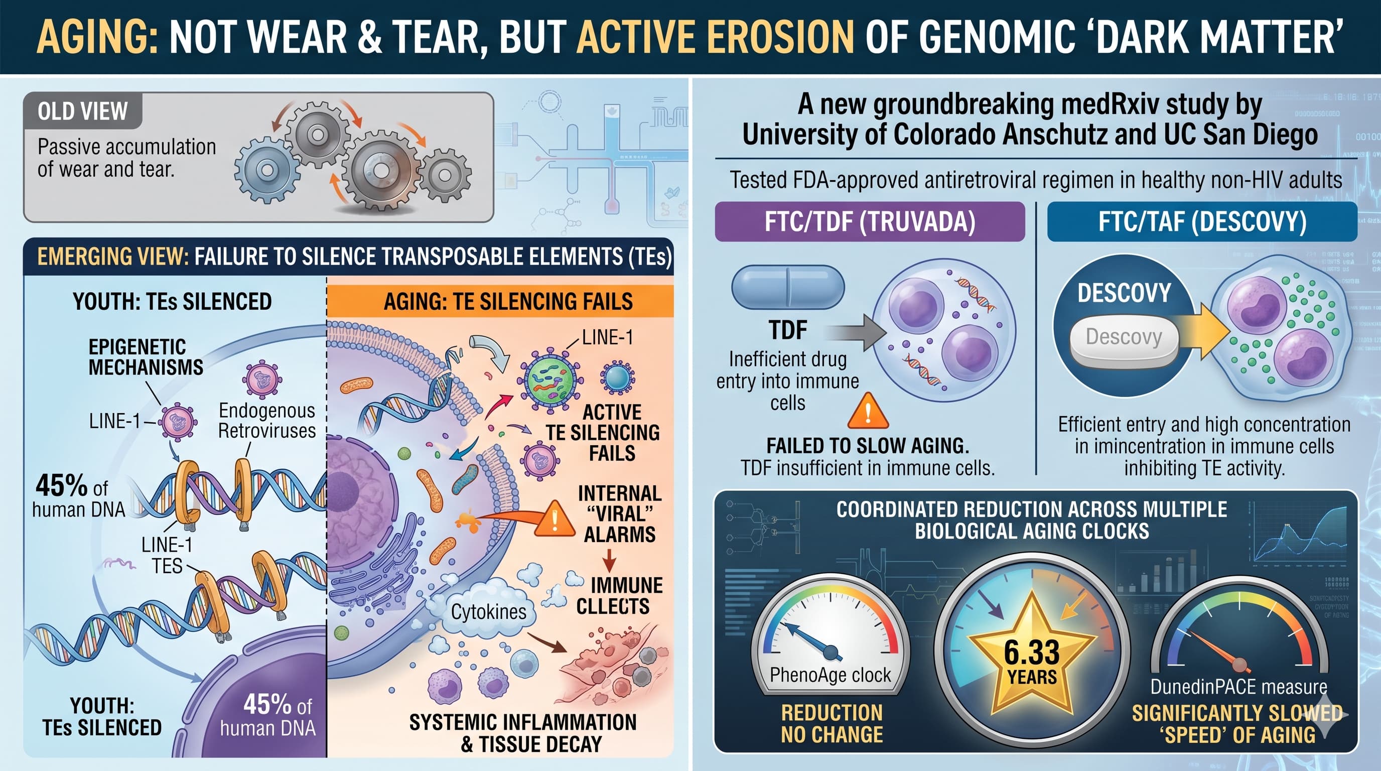 A groundbreaking post-hoc analysis published on the preprint server medRxiv provides the first human evidence that pharmacological intervention can stall this process. Researchers from the University of Colorado Anschutz Medical Center and UC San Diego investigated the effects of two FDA-approved antiretroviral regimens—emtricitabine/tenofovir alafenamide (FTC/TAF, known as Descovy) and emtricitabine/tenofovir disoproxil fumarate (FTC/TDF, known as Truvada)—on healthy, non-HIV adults.