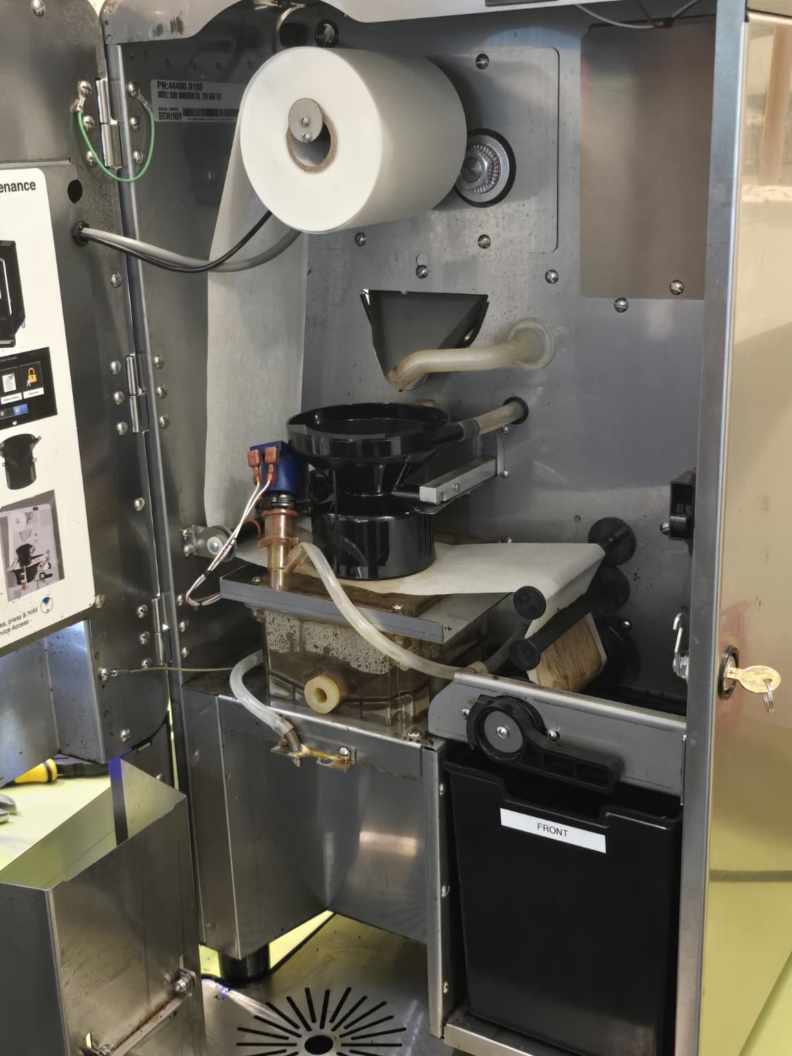 Dispense spout internals: inner channels are plastic; the shiny front plate is just a cover. Coffee passes through plastic here, then into your cup.