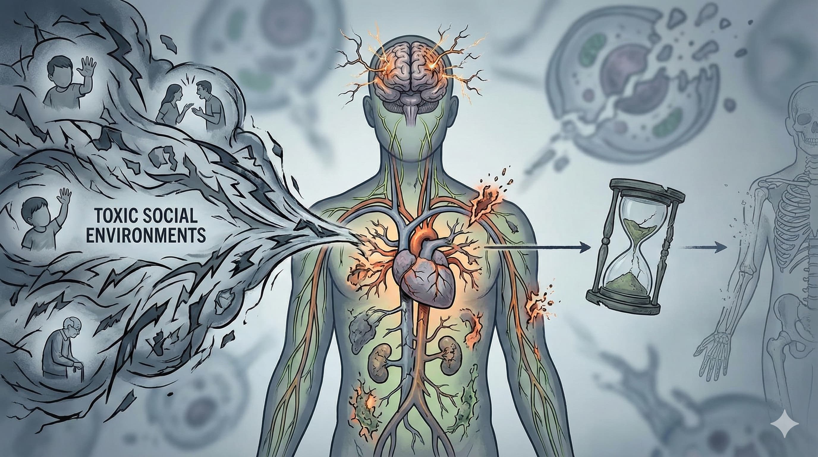 Organ-Specific Aging (Brain): The brain is the primary target organ of interpersonal adversity. The authors note structural degradation, specifically reduced volume and cortical thickness in the hippocampus, medial prefrontal cortex, and amygdala. Additionally, traumatic brain injuries (TBI) secondary to physical violence compound this neurodegeneration. This directly limits cognitive longevity and accelerates the onset of dementia and functional disability.