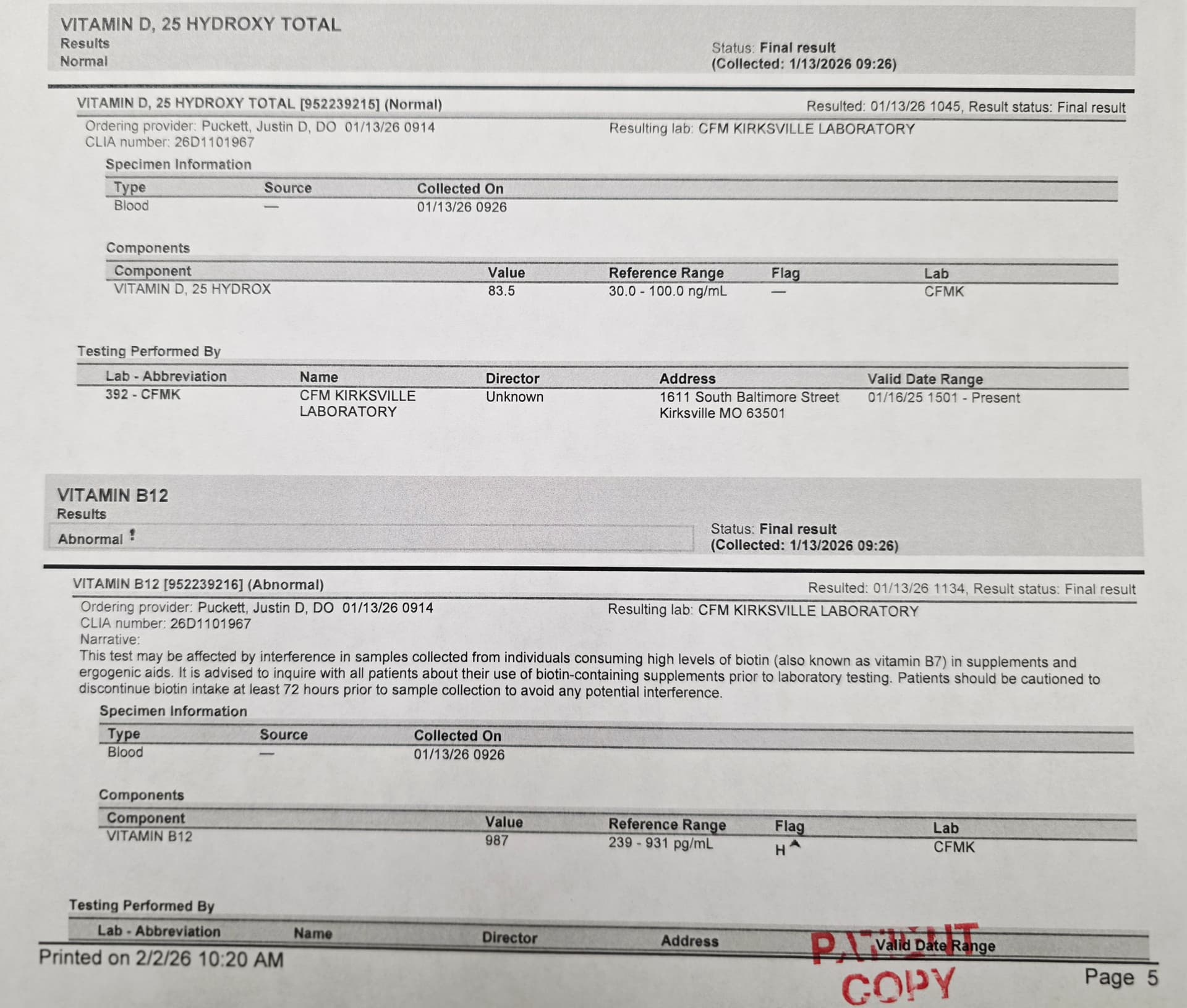 Also, my B12 is kept high… went up this time. Only slightly above range. But, my doctor said fine. Great for neurological function - cognitive function - mental health, energy function.