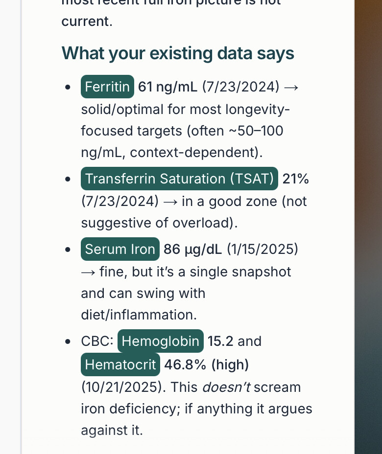 Serum Iron & TSAT: Interestingly, a 2025 study in Nutrients found that higher circulating serum iron and TSAT were actually associated with slower epigenetic aging, contradicting their negative impact on telomere length and genetically predicted lifespan.