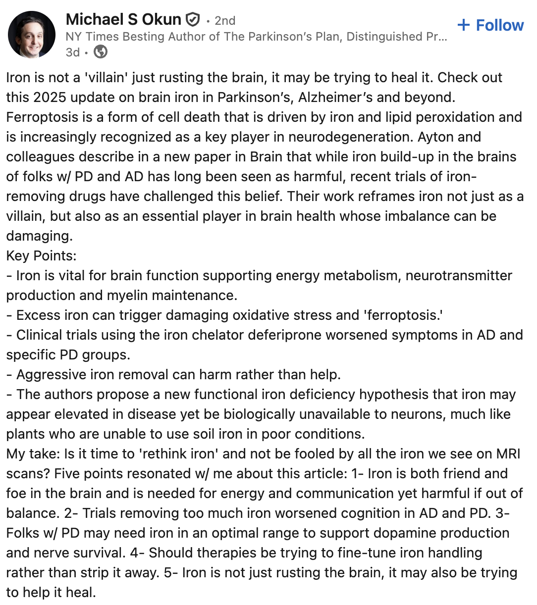 Iron is critical for numerous neurophysiological functions, while its dysregulation is potentially hazardous for neurodegeneration through oxidative stress and ferroptosis. For decades, elevated brain iron levels observed in neurodegenerative diseases such as Alzheimer’s, Parkinson’s, and amyotrophic lateral sclerosis was presumed to drive disease progression; a hypothesis that propelled clinical trials of strong iron chelators like deferiprone. Results from these trials, however, have challenged this paradigm, with deferiprone markedly worsening outcomes in Alzheimer’s and, in certain contexts, Parkinson’s patients. These findings underscore the vital role of iron for brain health and suggest functional compensatory mechanisms that could become deleterious at the extremes of iron distribution (both low and high levels). Here, we outline an evolving understanding of iron’s role in neurodegeneration, and we explore pathways for therapeutic development strategies that mitigate potential iron-mediated damage, while preserving its essential functions in the brain.