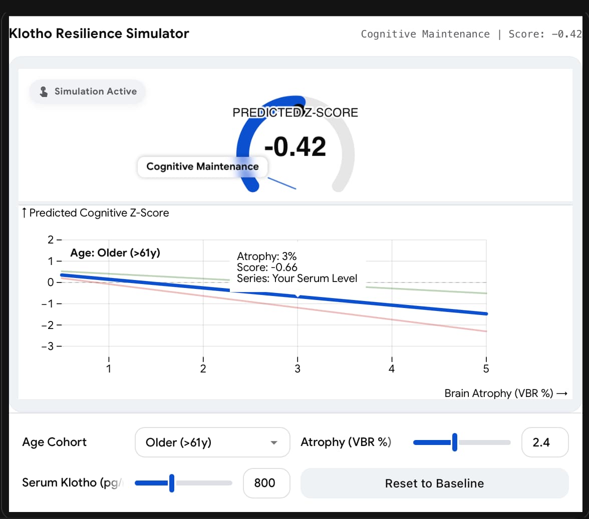 - Resilience > Repair: This confirms Klotho acts as a “buffer.” It doesn’t stop the brain from shrinking (atrophy), but it stops the symptoms of that shrinkage from manifesting as dementia.