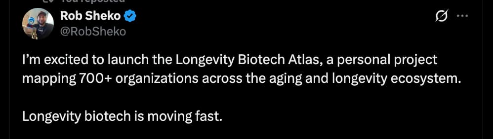 If you’re interested in aging biology, biotech, investing, company formation, or the future of medicine, follow along. I’ll be sharing updates, maps of different subfields, and analyses of where the biggest opportunities and gaps may be. Let me know what you find useful!