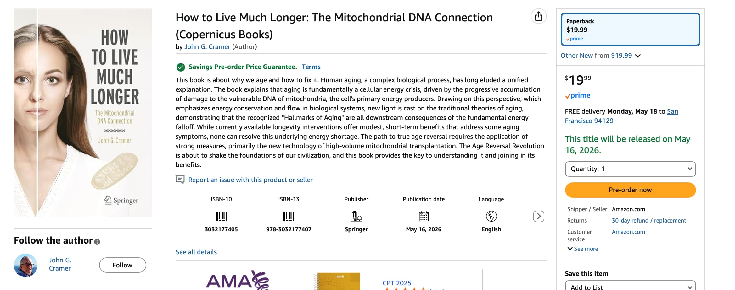 John Cramer has written a book, focusing on the role of mitochondria in aging, to be published by Springer May 18 - available for pre-order on Amazon. Mitrix Bio makes a pretty good case that we are unlikely to achieve systemic age reversal without focusing on mitochondrial DNA as well as nuclear DNA. Cell growth, division, and “epigenetic age reversal” (via OSK etc.) are all highly energy intensive, and nearly all that energy must come from mitochondria … which suffer cumulative mtDNA damage as we age. There’s (much) more to this story – the mitochondria play a far more extensive role than “we were taught in college” - migrating constantly from stem cells or platelets to other cells, and even (it is believed) coordinating their activity across nearby cells via intra-cellular signaling. Though mitochondrial dysfunction is listed as one of the “Hallmarks of Aging”, IMHO this aspect of aging has been underestimated for a long time.