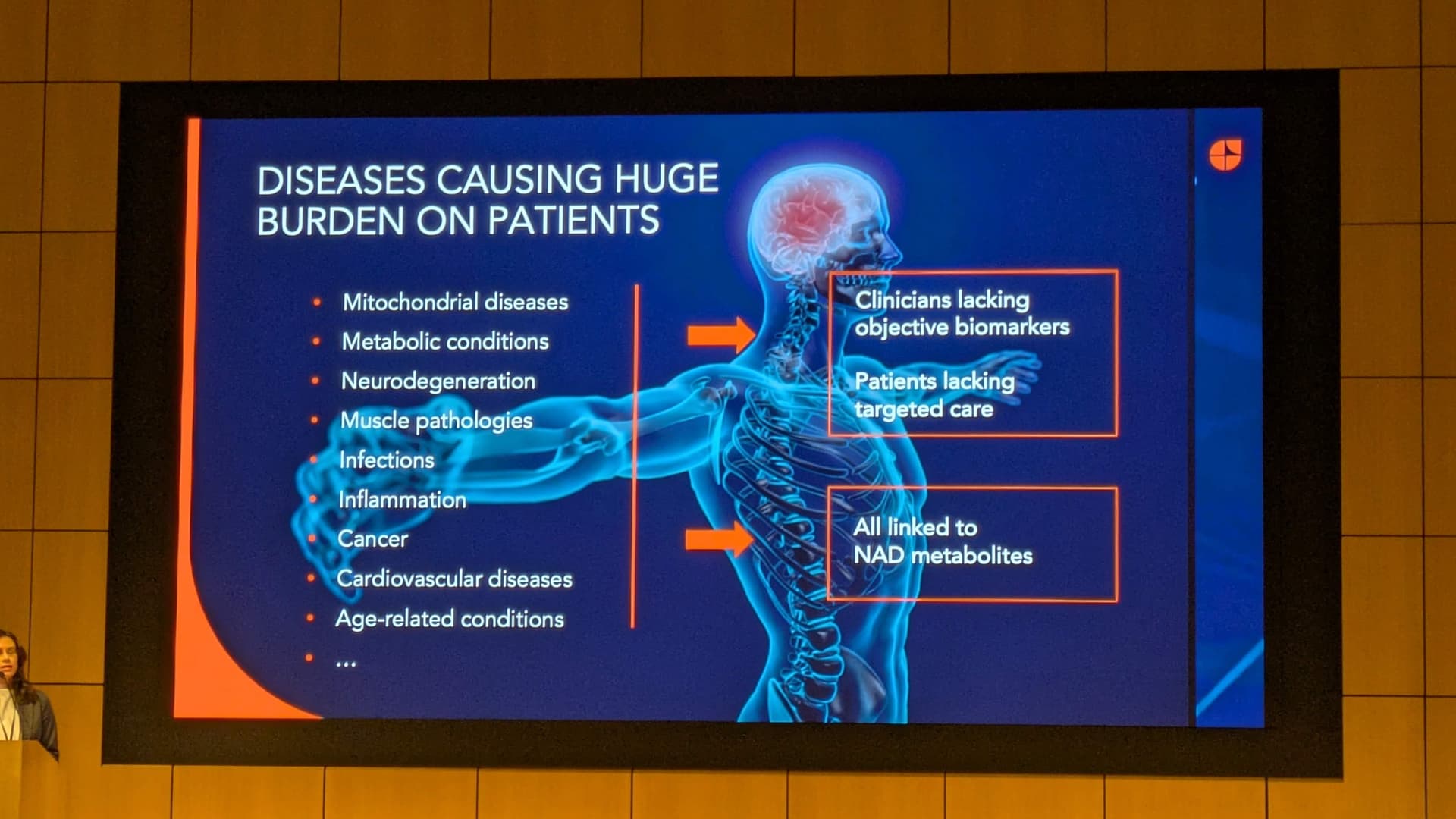The presentation (Image 1) identifies a spectrum of diseases characterized by a “huge burden on patients,” ranging from orphan mitochondrial diseases to widespread age-related conditions. A unifying feature of these pathologies is their link to NAD metabolites. However, a disconnect exists between the biochemical understanding of these diseases and clinical care delivery.