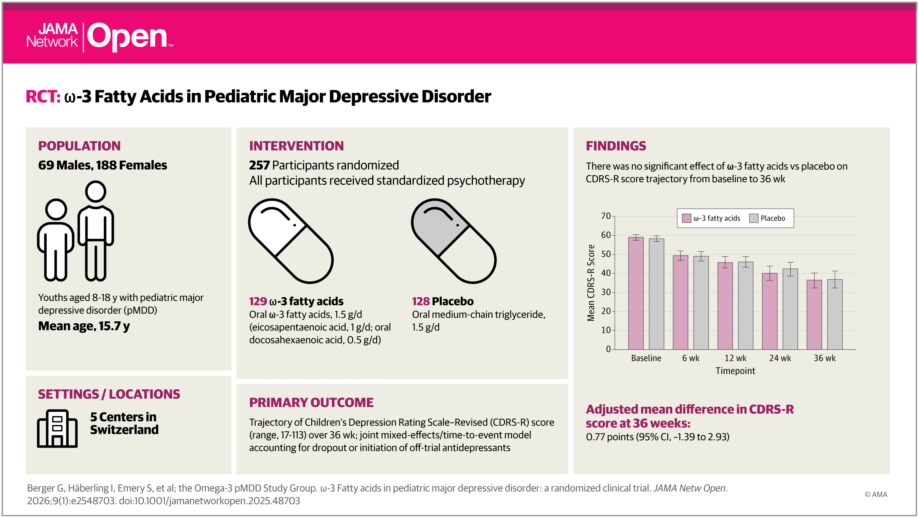 In this RCT that included help-seeking children and adolescents with moderate-to-severe MDD receiving professional multimodal treatment, we found no evidence that ω-3 supplementation provided benefit compared with placebo. Furthermore, ω-3 supplementation neither reduced antidepressant use nor conferred protection against suicidality.