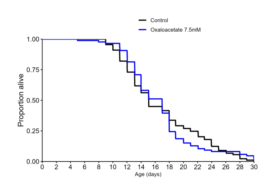 Oxaloacetate haș controls with median lifespan of 23.1 days, across 60 animals and 4 replicates