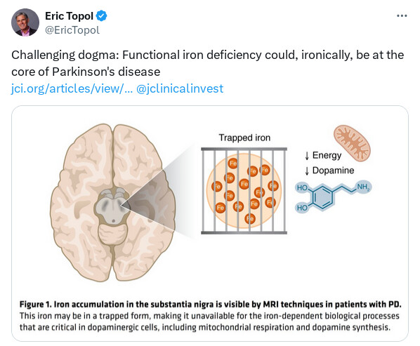 In conclusion, multiple lines of evidence call into question the iron overload hypothesis in PD pathology. If we consider instead that cells in humans with PD may be suffering from a functional iron deficiency (4), much more of the available data make sense. Epidemiological studies link systemic anemia and recent blood donations to higher PD risk (29). TH function and mitochondrial respiration both rely on iron; thus, functional iron deficiency will lead to decreases in dopamine tone and loss of mitochondrial respiration (which ultimately will drive cell death), both of which are hallmarks of PD. Iron removal via chelation only exacerbates these problems, particularly in drug-naive patients where excess l-DOPA is not on board to mask a decline (1, 2). Iron therapy, in RLS and in PD, benefits patients (9, 10). Removing iron in brains of patients with PD via chelation has been sufficiently tested clinically, with negative effects on patient outcomes. We should now consider the alternative hypothesis of functional iron deficiency and how we might tackle it therapeutically.