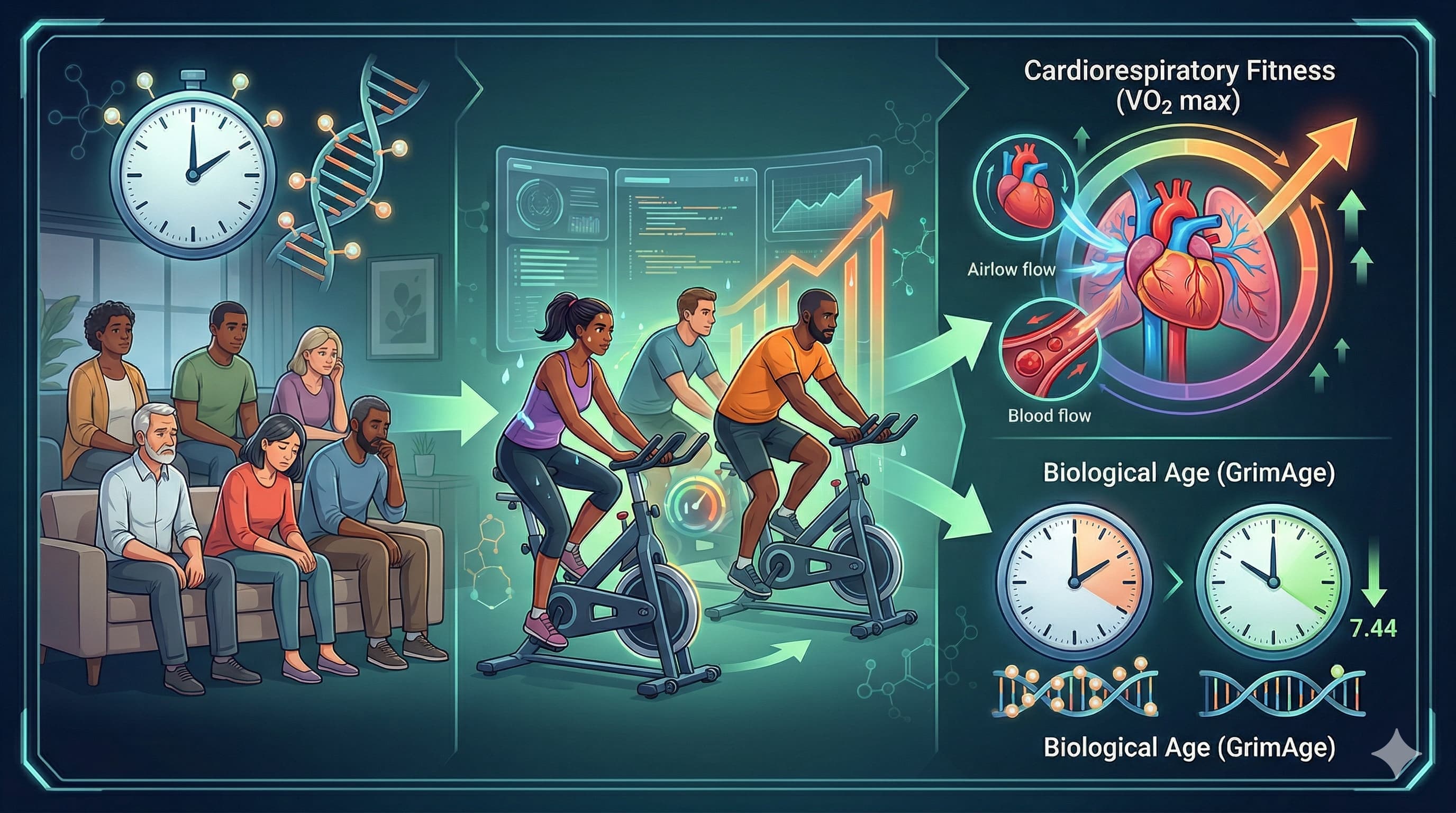 A new clinical pilot study provides compelling evidence that targeted, progressive cardiovascular effort has a rapid and measurable impact on these molecular biomarkers. Researchers implemented a six-month, personalized, cycling-based endurance exercise training (EET) program for 42 physically inactive adults between the ages of 35 and 65. The trial data demonstrated that participants who successfully adhered to the protocol experienced a highly significant 20% increase in cardiorespiratory fitness, measured via maximum oxygen consumption (VO2 max). More importantly, their biological age, as calculated by the GrimAge clock, decreased by an average of 7.44 months relative to their expected chronological aging trajectory.