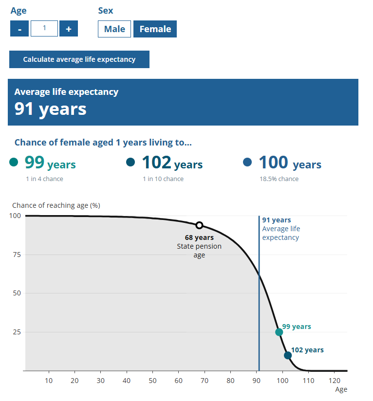 Agree, centenarians are rare, however, I’m surprised by some online calculators that paint a much more optimistic picture for the future. For instance, the UK Office for National Statistics (ONS) suggests that a one-year-old girl today has roughly an 18% chance of hitting the 100-year mark. (see Life expectancy calculator - Office for National Statistics)