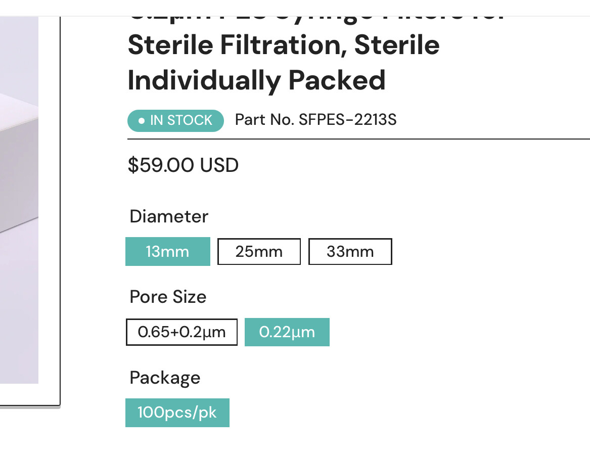 You would add the water to your peptide in the vial it came in, as usual. Then you pull of it into a syringe… and then you take the needle off and put a PES filter on the syringe… and then you attach a clean needle on top of the filter…and then you inject it all into a brand new sterile vial. Tada!