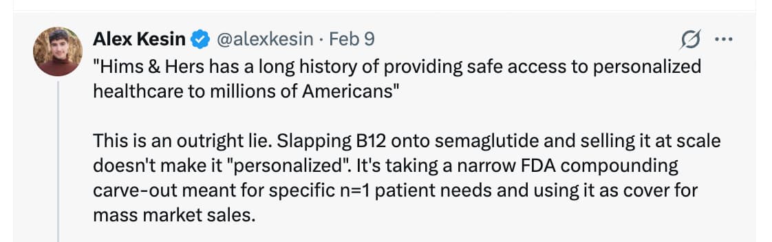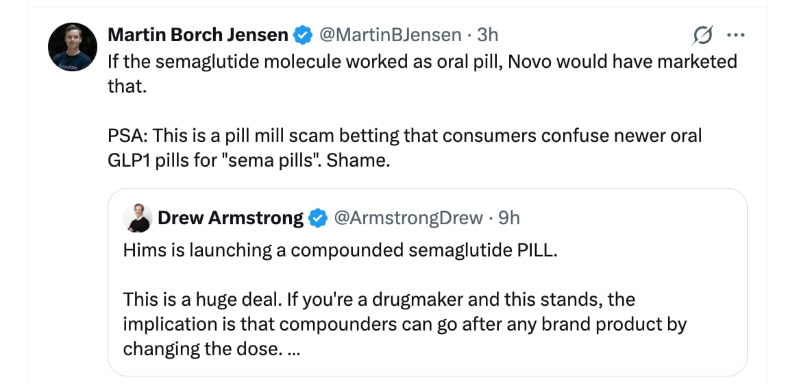 Wow, feels like Hims is playing with fire here. It’s hard to argue that the Wegovy pill is in shortage or that they are truly compounding custom tablets.
