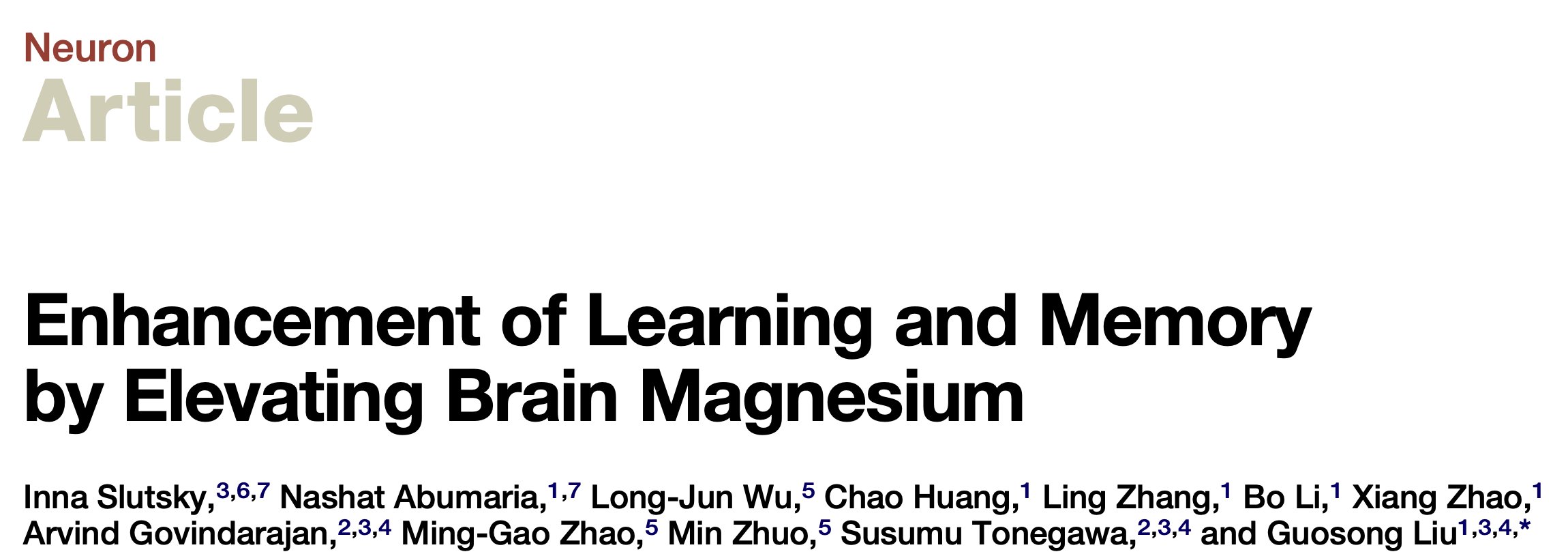 Learning and memory are fundamental brain functions affected by dietary and environmental factors. Here, we show that increasing brain magnesium using a newly developed magnesium compound (magnesium-L-threonate, MgT) leads to the enhancement of learning abilities, working memory, and short- and long-term memory in rats. The pattern completion ability was also improved in aged rats. MgT-treated rats had higher density of synaptophysin-/synaptobrevin-positive puncta in DG and CA1 subregions of hippocampus that were correlated with memory improvement. Functionally, magnesium increased the number of functional presynaptic release sites, while it reduced their release probability. The resultant synaptic reconfiguration enabled selective enhancement of synaptic transmission for burst inputs. Coupled with concurrent upregulation of NR2B-containing NMDA receptors and its downstream signaling, synaptic plasticity induced by correlated inputs was enhanced. Our findings suggest that an increase in brain magnesium enhances both short-term synaptic facilitation and long-term potentiation and improves learning and memory functions.