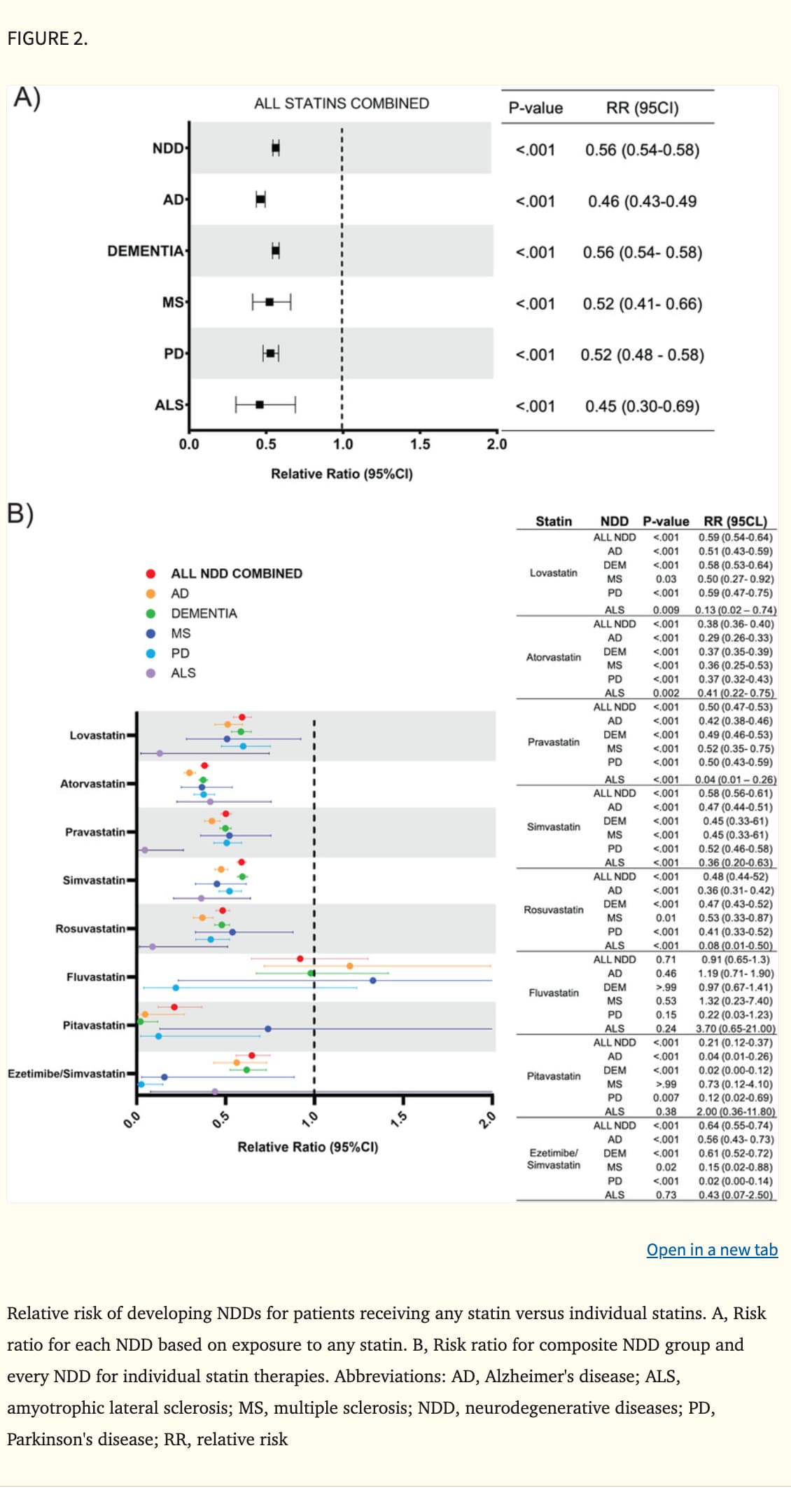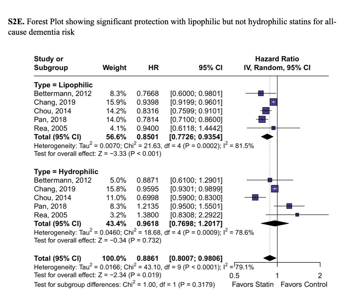 For AD specifically, both hydrophilic (17% reduction) and lipophilic (15% reduction) statins showed significant effects.