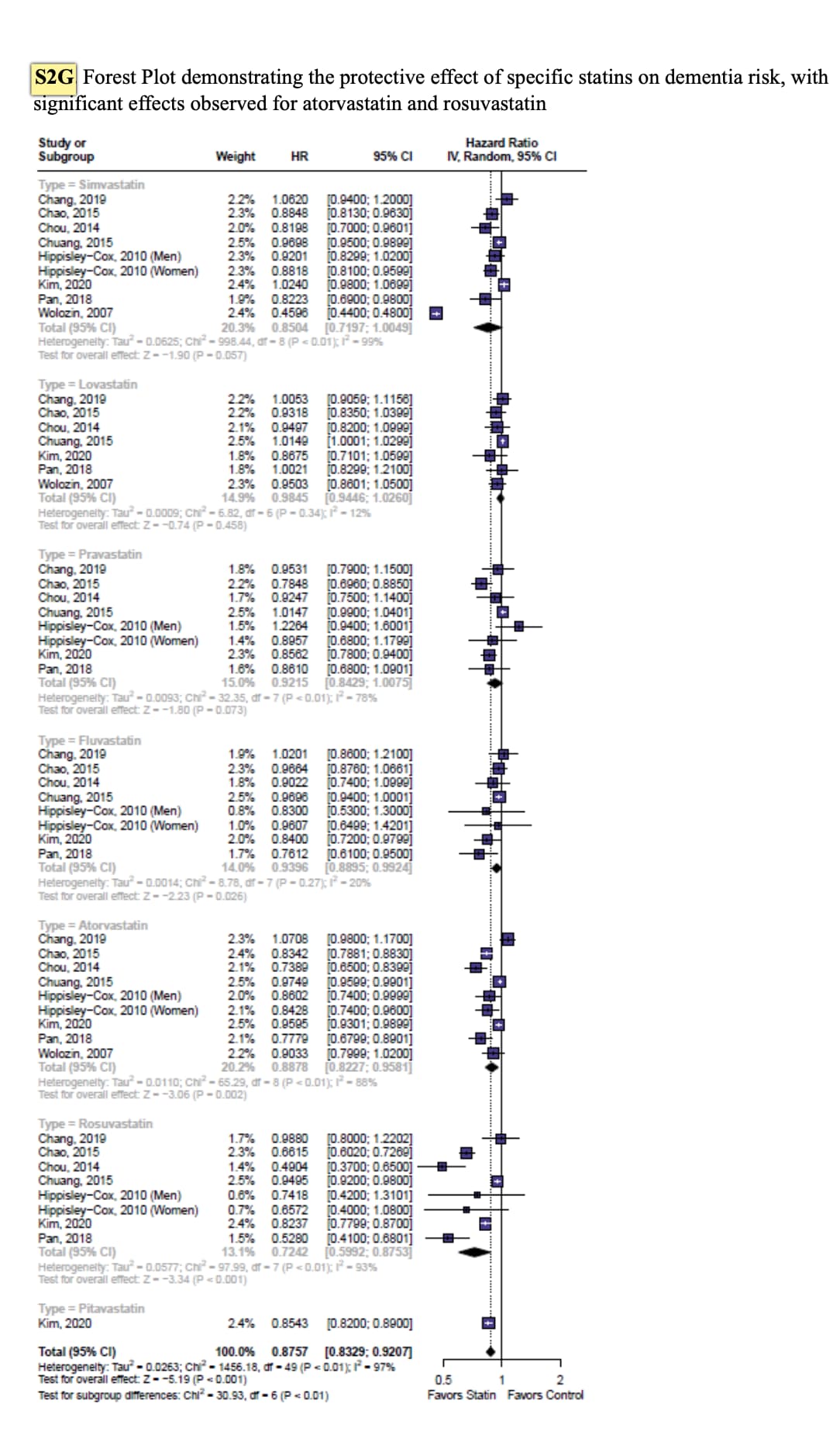"Additionally, rosuvastatin demonstrated the most pronounced protective effect for all‐cause dementia among specific statins (HR 0.72; 95% CI: 0.60 to 0.88). "