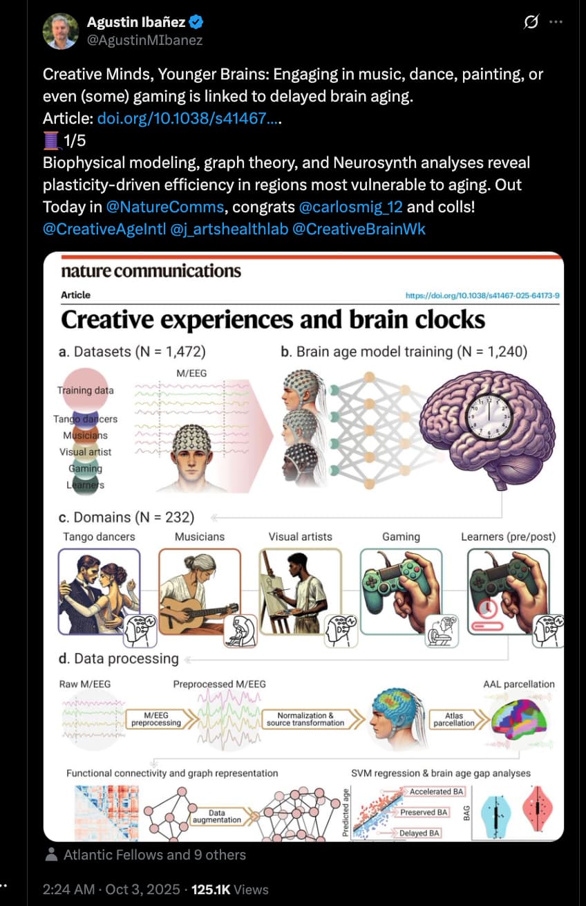 Whether it’s dancing the tango or playing the guitar, engaging in a creative pastime can slow brain ageing, according to a study of dancers, musicians, artists and video game players from multiple countries.
