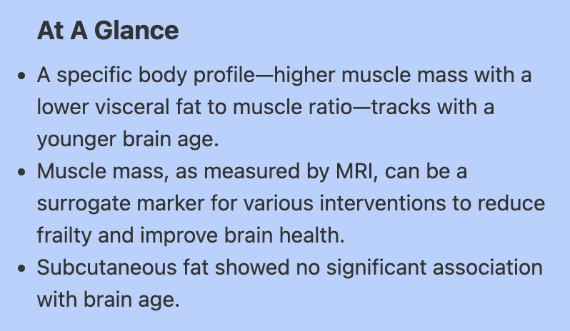 While it is commonly known that chronological aging translates to loss of muscle mass and increased hidden belly fat, this work shows that these health measures relate to brain aging itself,” Dr. Raji said. “It shows muscle and fat mass quantified in the body are key reflectors of brain health, as tracked with brain aging.”