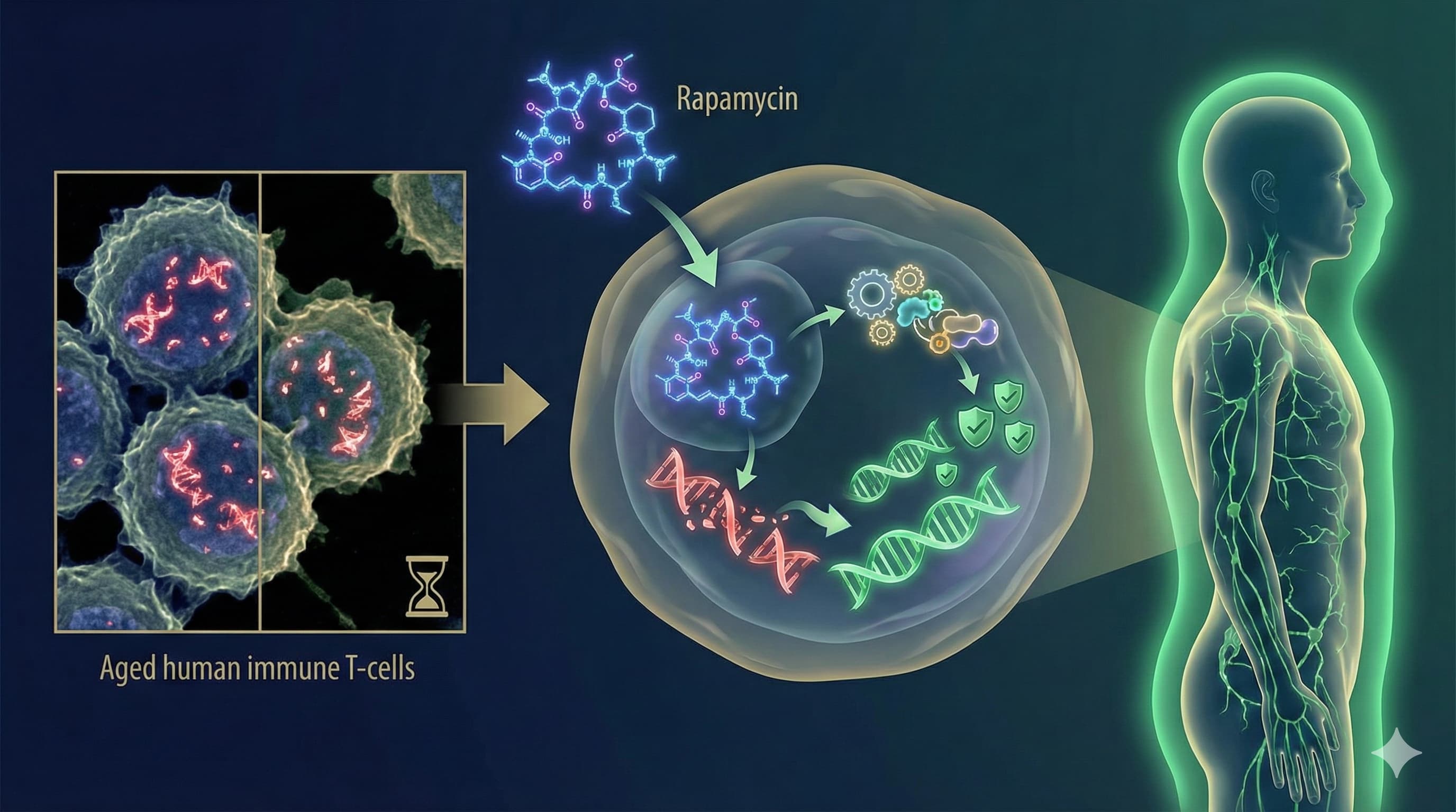 The study investigated human T cells exposed to genotoxic stress and found that rapamycin dramatically suppressed DNA damage-induced senescence. Critically, it did not achieve this by halting cell division, slowing protein synthesis, or upregulating autophagyâthe traditional mechanistic suspects. Instead, it directly reduced the physical burden of DNA lesions and improved cellular survival rates following severe stress. Translating this to clinical relevance, the research team conducted a pilot placebo-controlled trial in older adults. Administering a low dose of 1 mg/day for four months, they observed a significant reduction in p21, a primary marker of cellular senescence, within the circulating immune cells of the treatment group. Exhaustion markers on T cells also dropped. This indicates that low-dose mTOR inhibition actively protects the human immune system from the DNA instability that drives age-related decline. For biohackers and clinicians focused on healthspan, this provides actionable evidence that rapamycinâs geroprotective effects translate to practical human immune resilience.