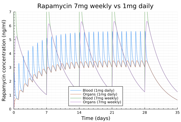 Here is a comparison of rapamycin 7mg weekly vs 1mg daily.