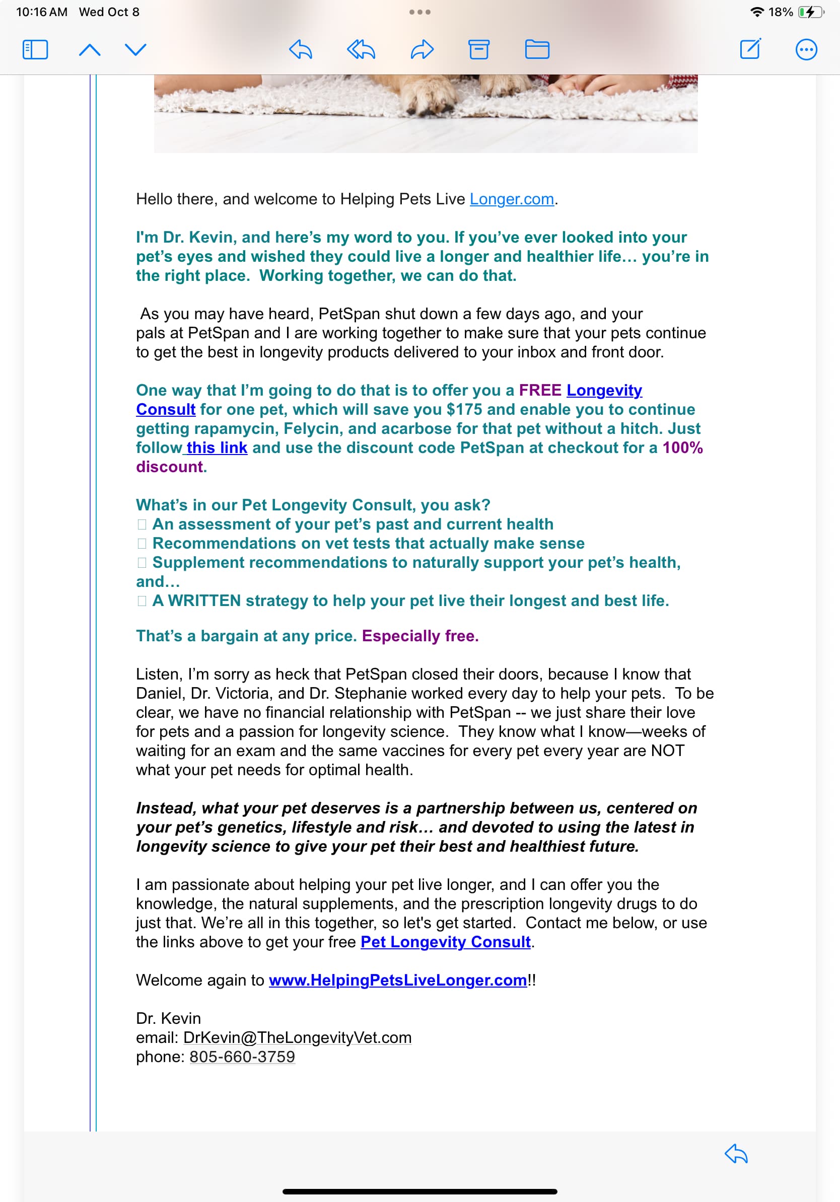 But it’s the results that count. He lost half his ear to surgery and the cancer kept spreading. No further remedies were offered. Cancer was spreading very rapidly. In that scenario, we felt justified trying our own protocol. I now believe we’d have been much better off putting the cat on rapamycin from the get-go, not waiting for the cancer to spread and trying the conventional veterinary interventions which the vets themselves admit are only stopgap and no actual solution.